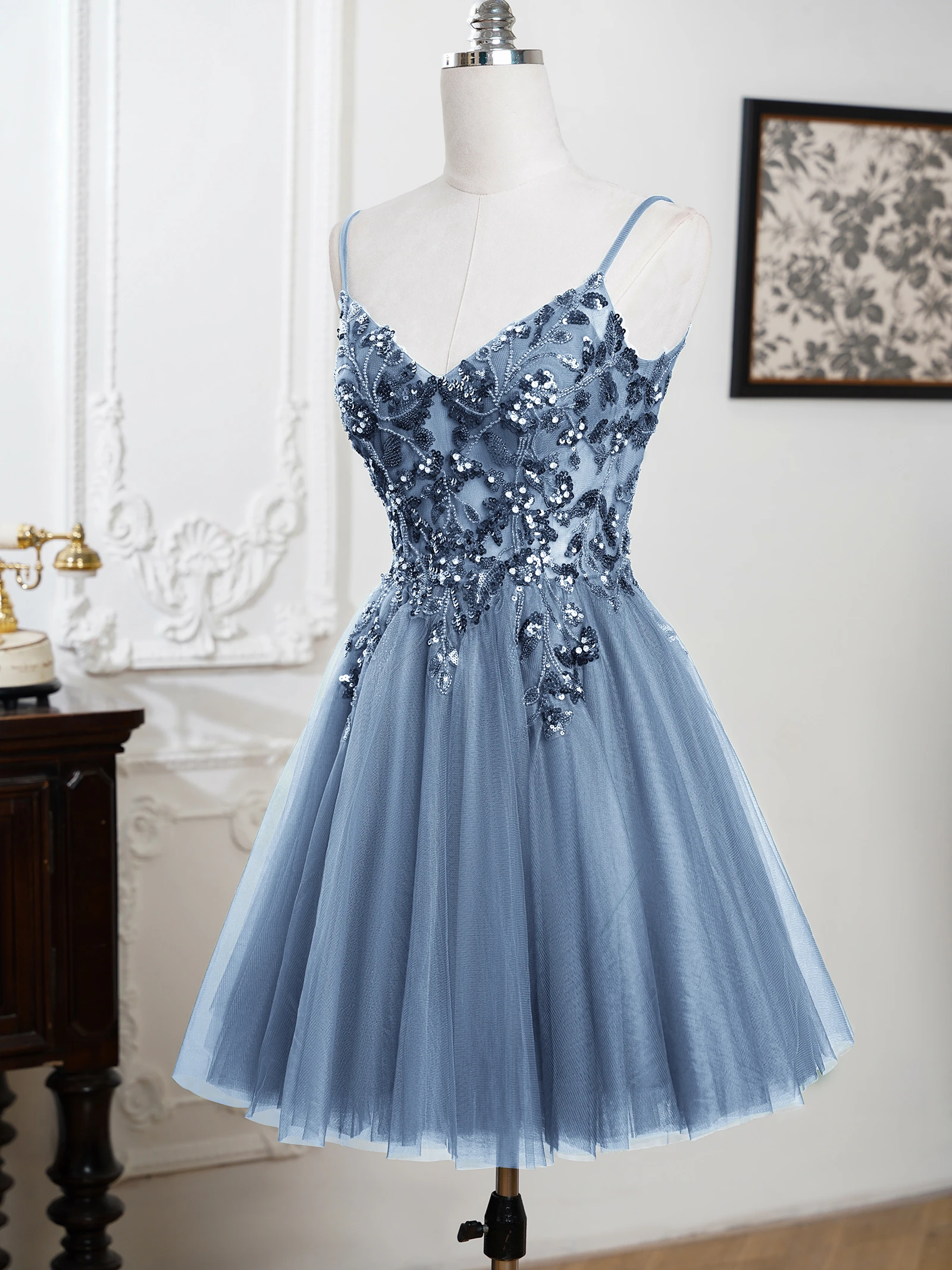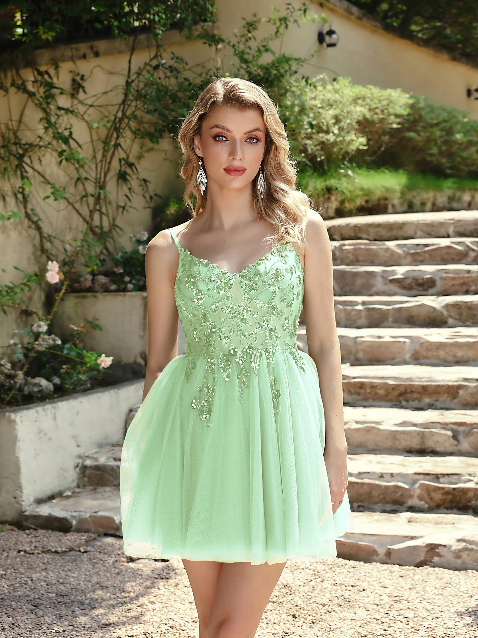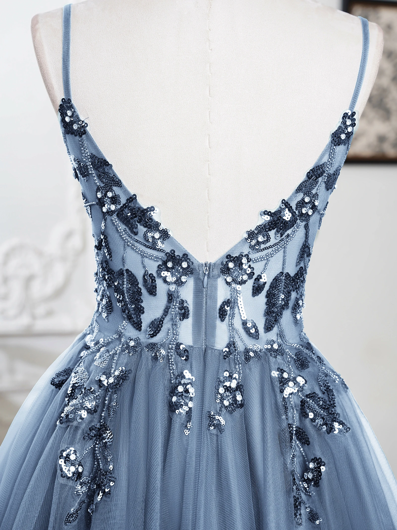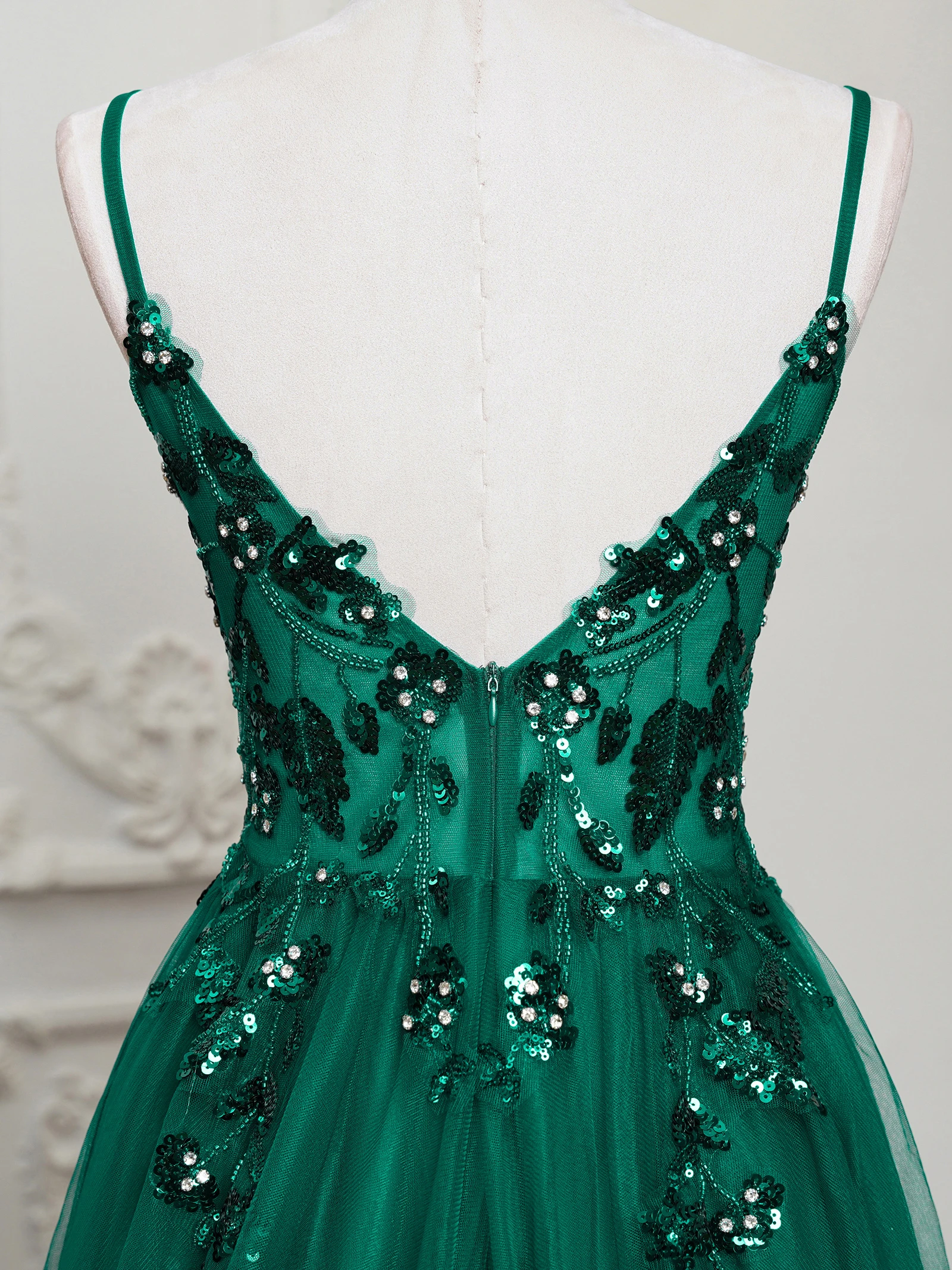 MisShow Sling Evening Dresses Sexy Spaghetti Straps V-Neck Illusion Sequins Appliques Prom Dress A-Line Train High Split Gowns Short Homecoming Dresses