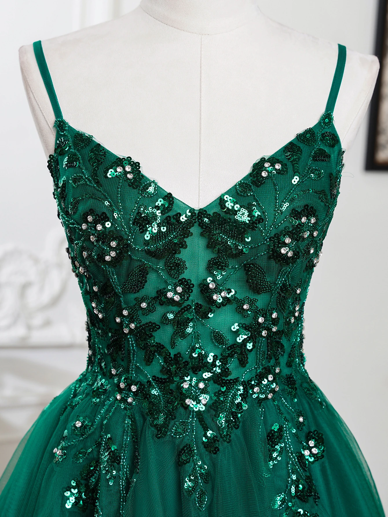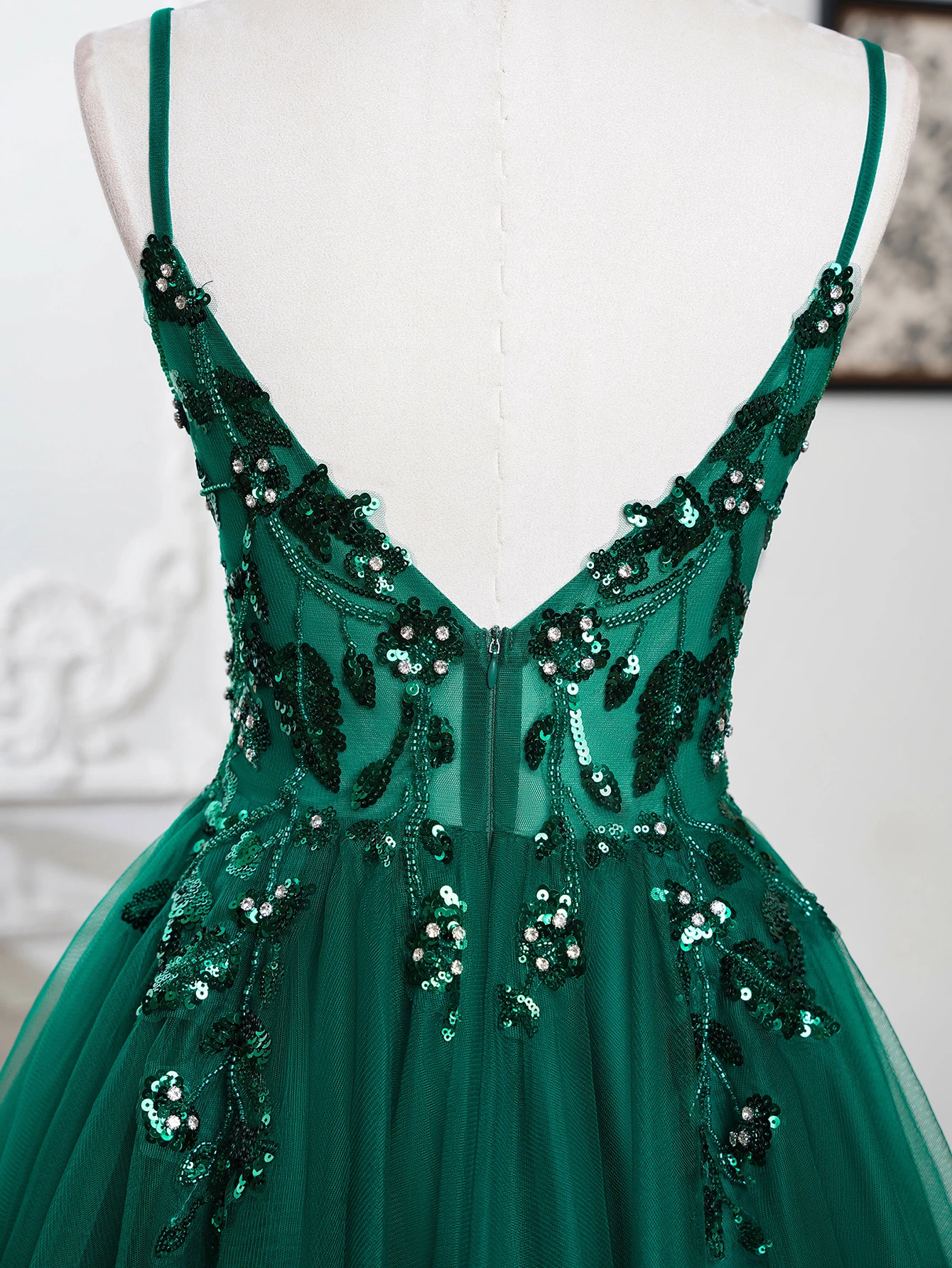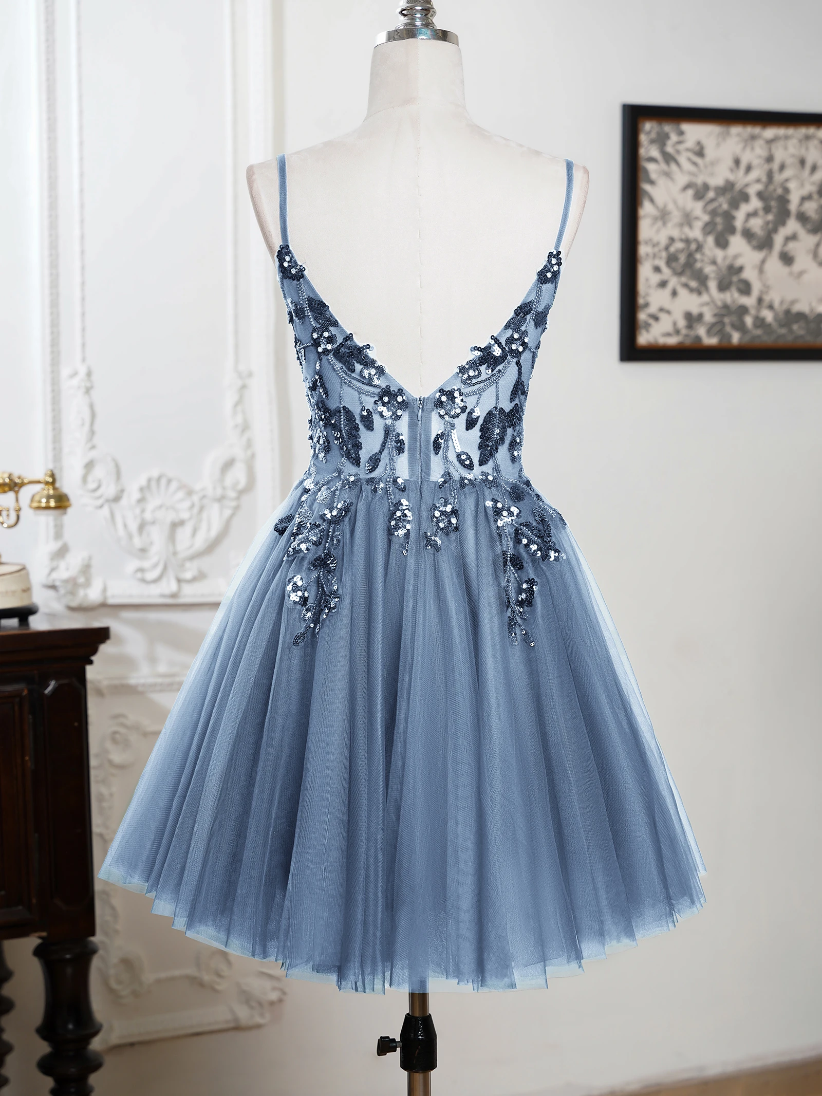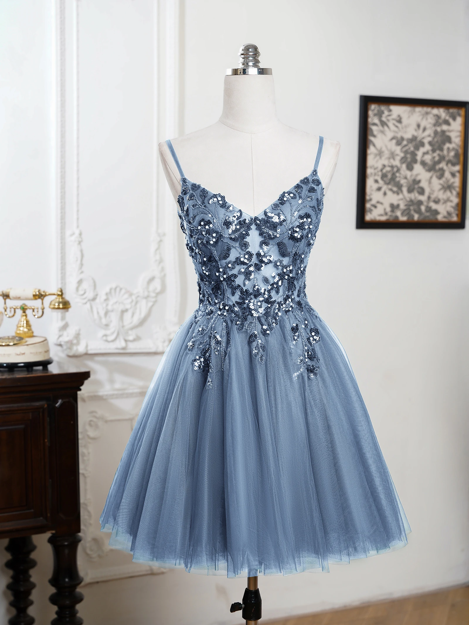 MisShow Sling Evening Dresses Sexy Spaghetti Straps V-Neck Illusion Sequins Appliques Prom Dress A-Line Train High Split Gowns Short Homecoming Dresses