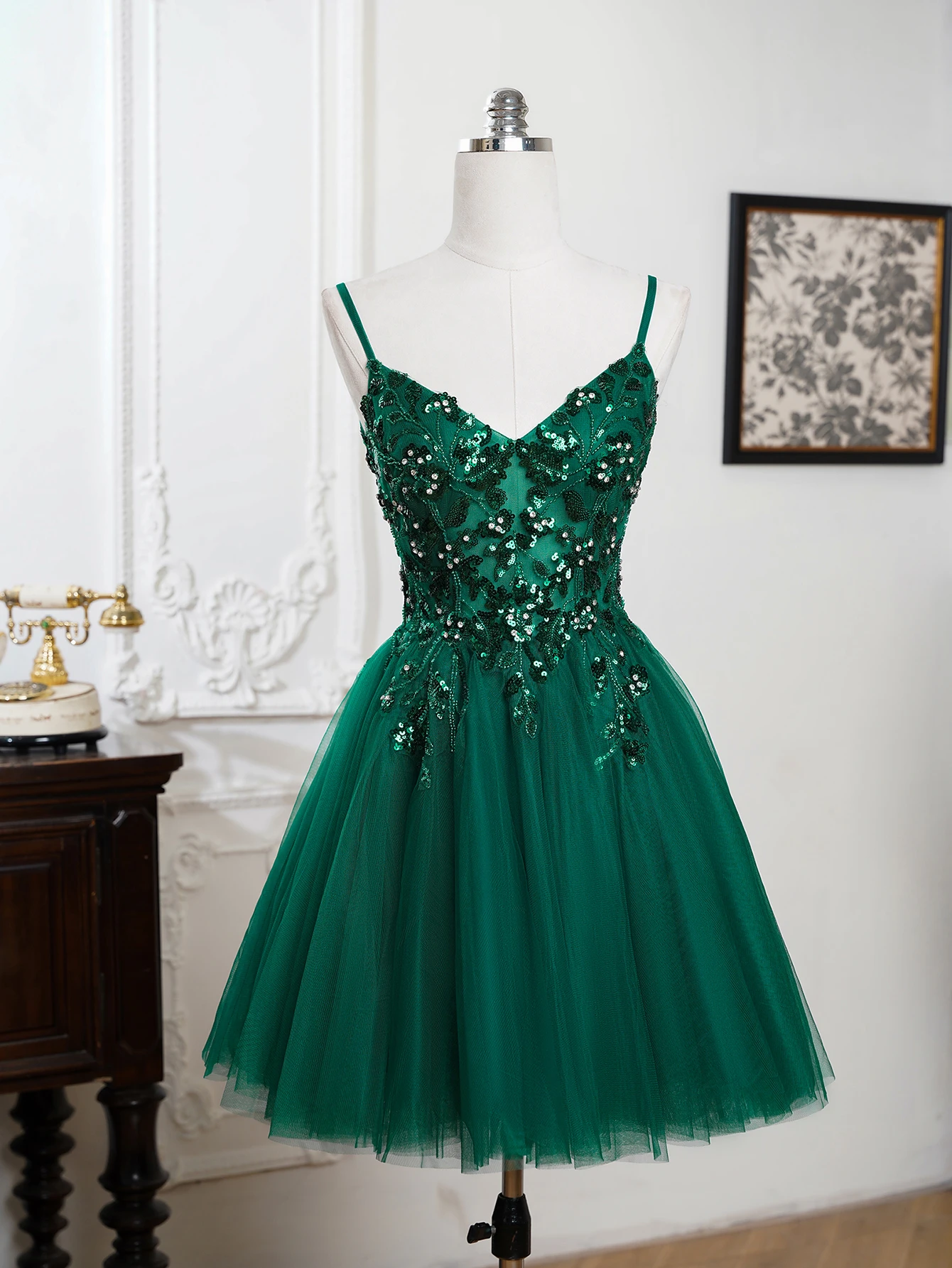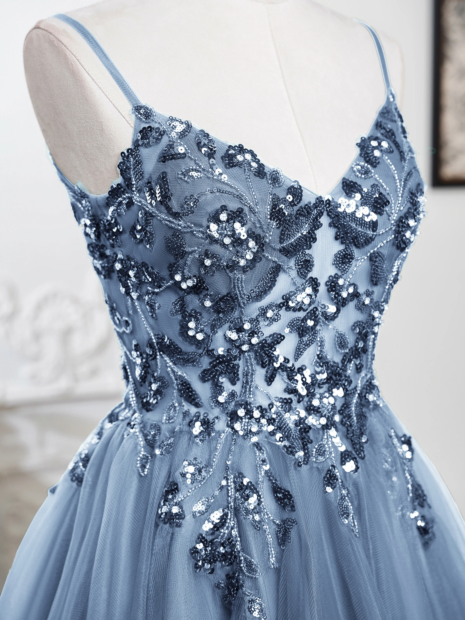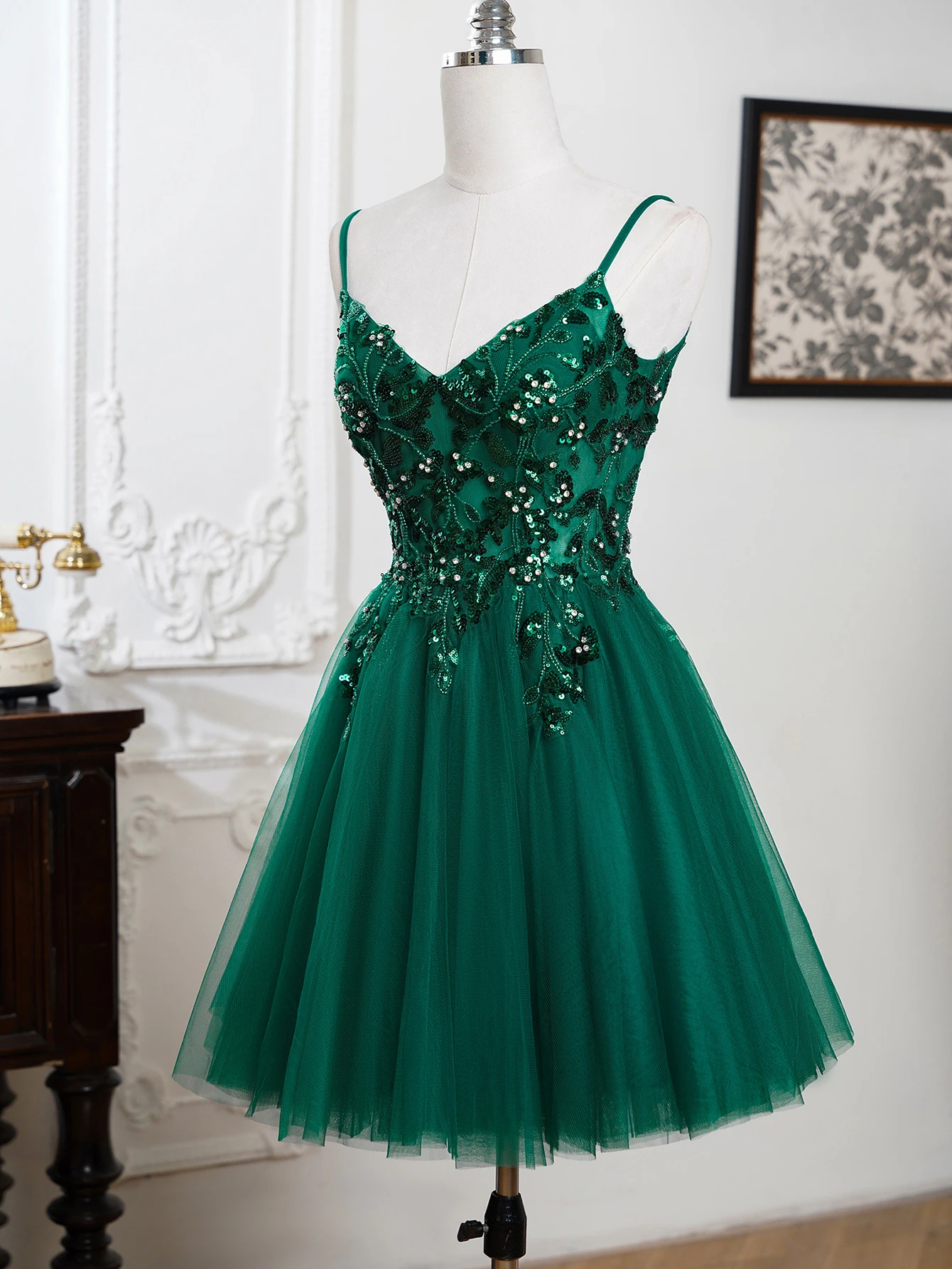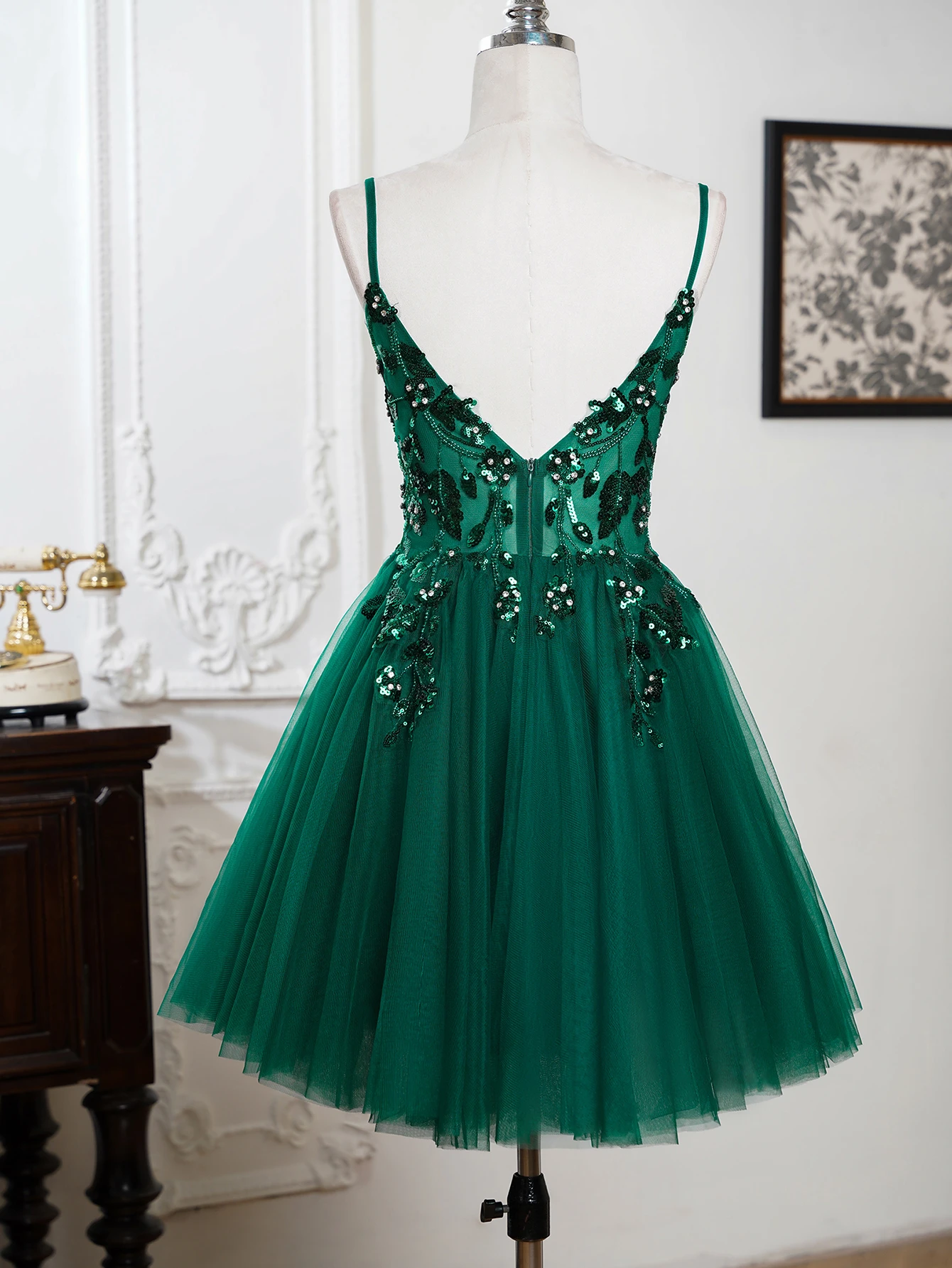 MisShow Sling Evening Dresses Sexy Spaghetti Straps V-Neck Illusion Sequins Appliques Prom Dress A-Line Train High Split Gowns Short Homecoming Dresses