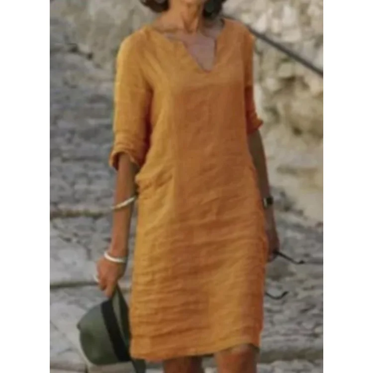 A well-fitting cotton/linen dress that is delightfully airy. Fast delivery. Beautiful color. Good fit