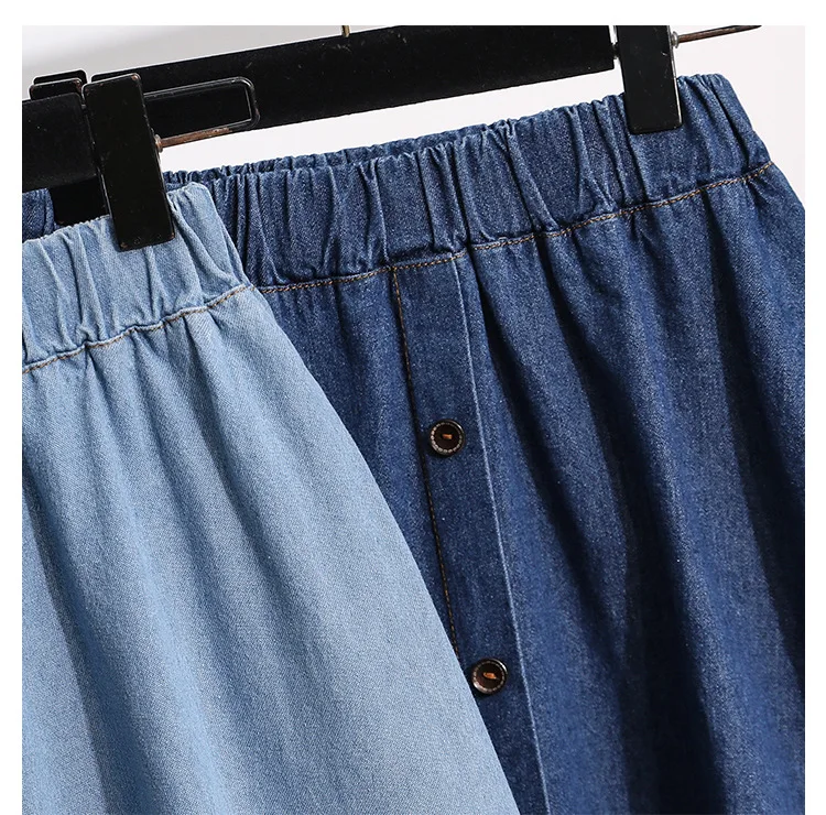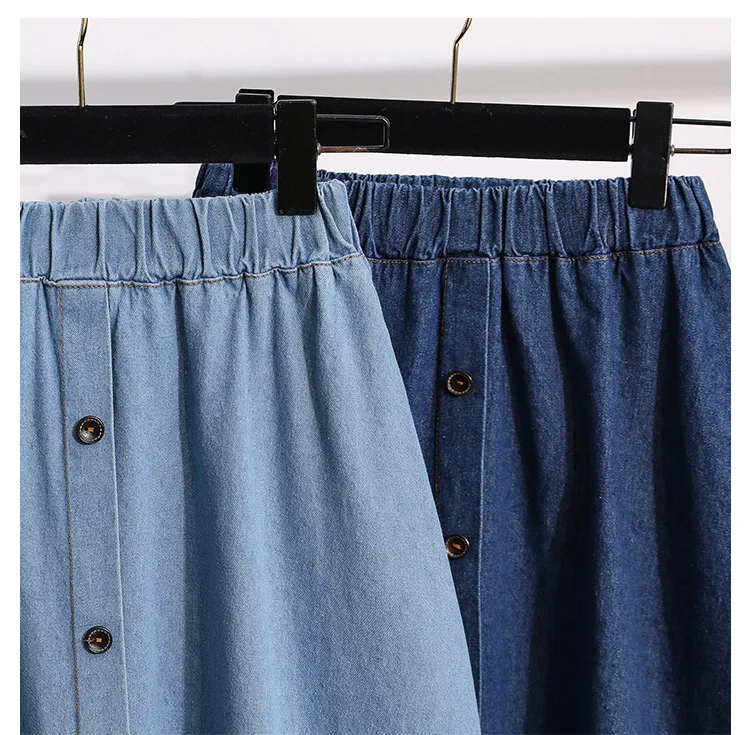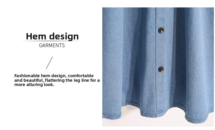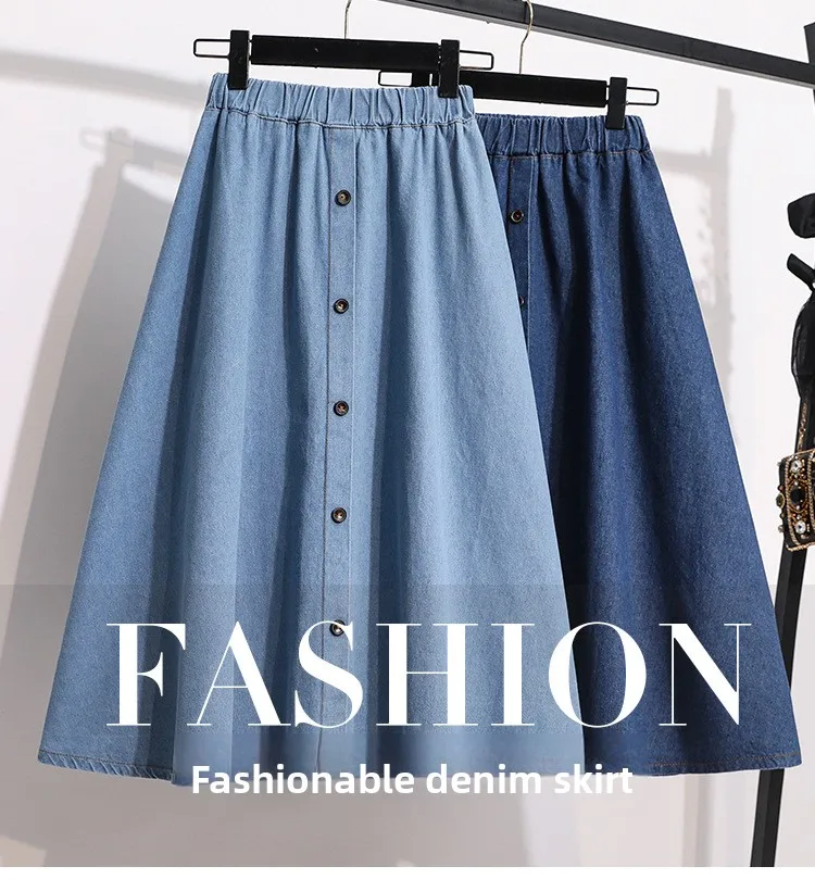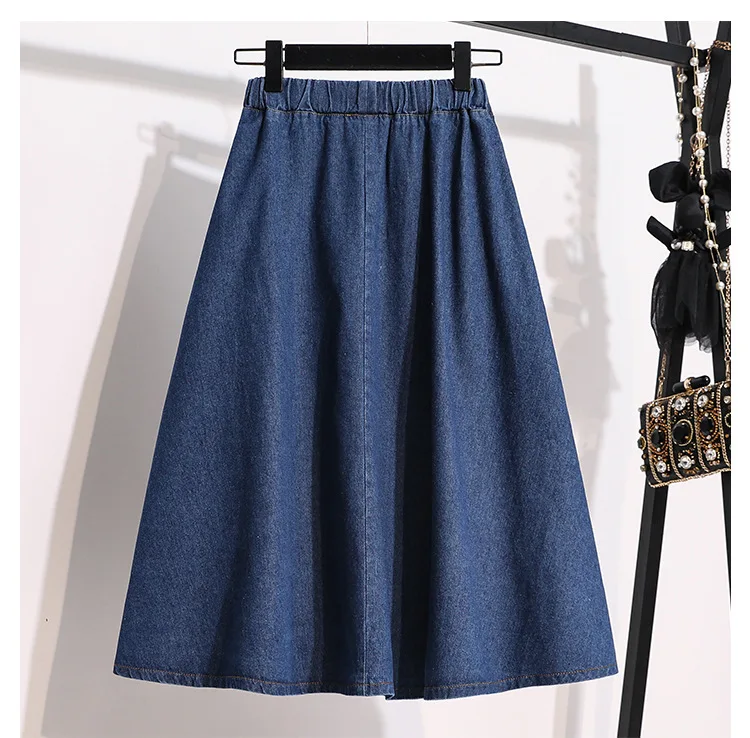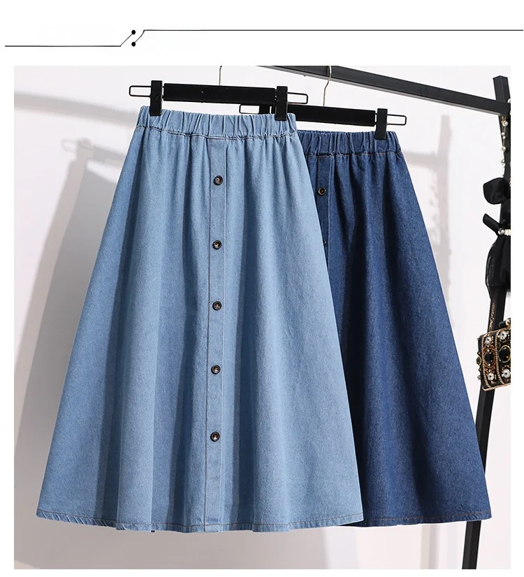 The pure color pattern of this denim skirt adds a touch of simplicity and elegance, making it a versatile piece for any outfit.