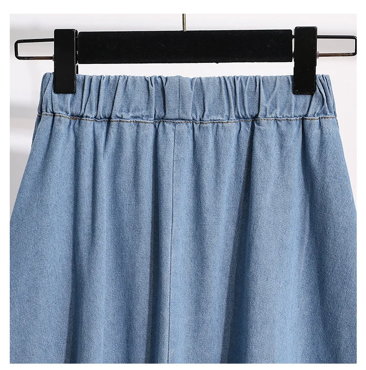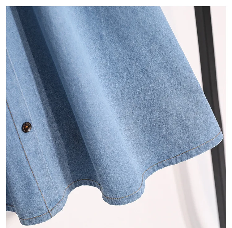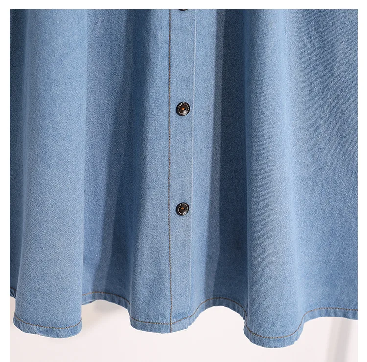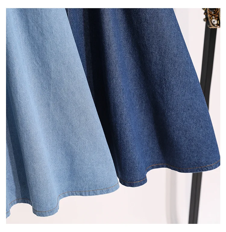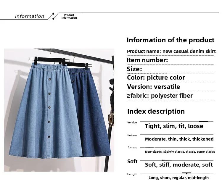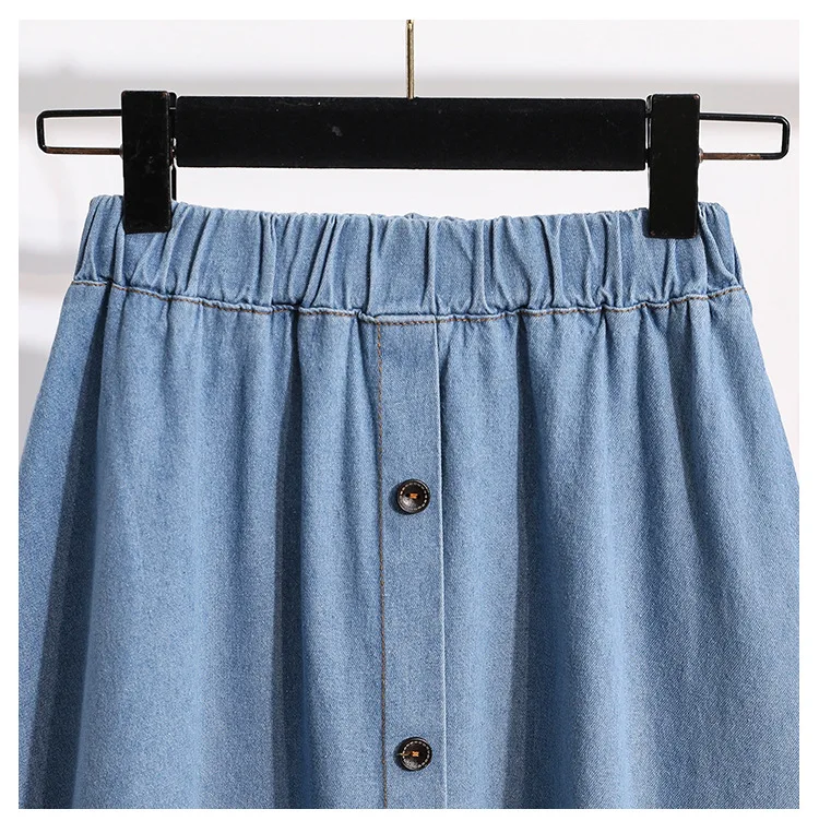 The pure color pattern of this denim skirt adds a touch of simplicity and elegance, making it a versatile piece for any outfit.