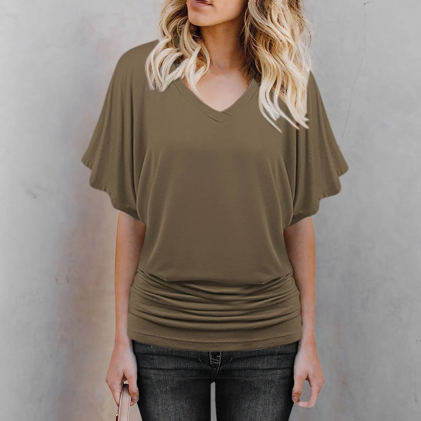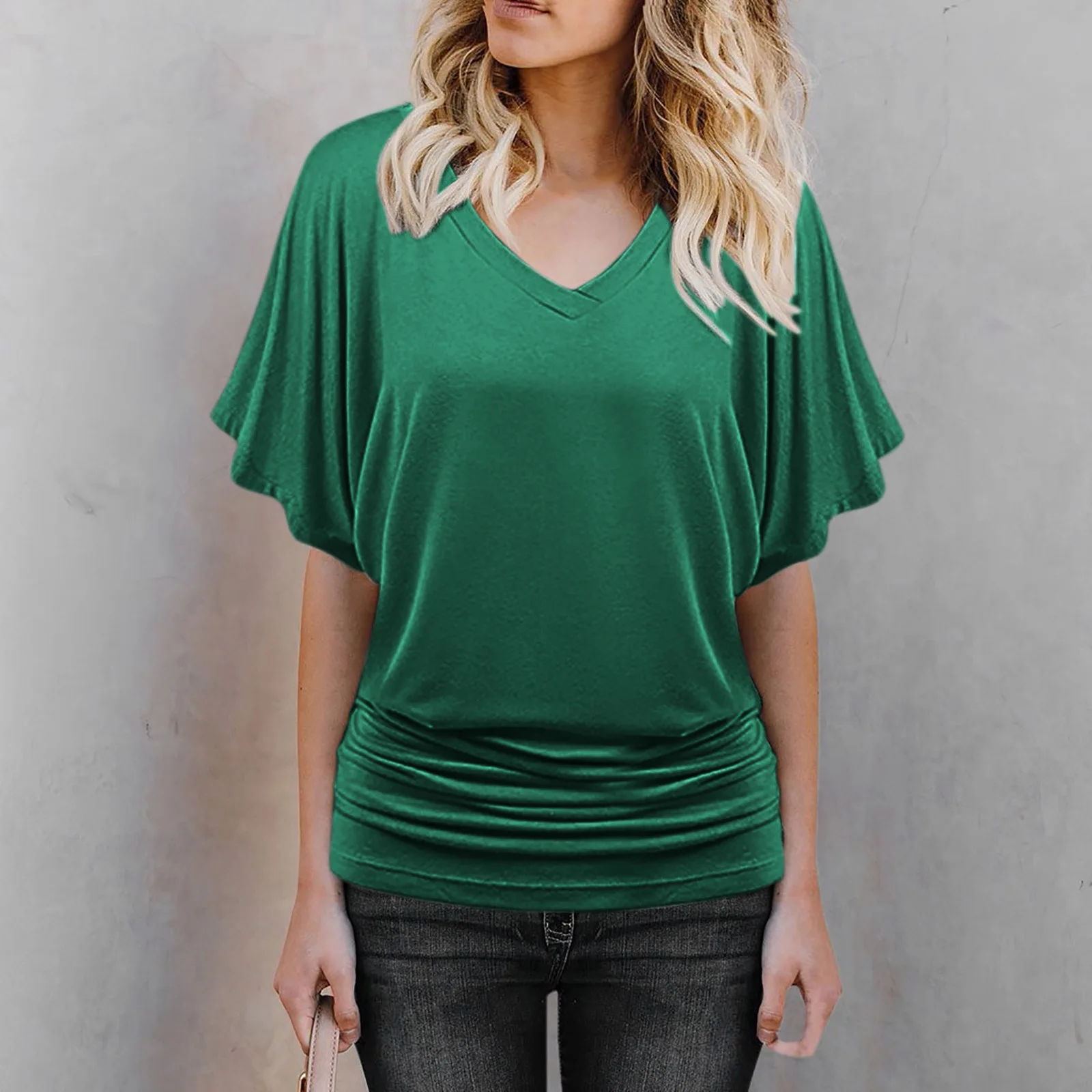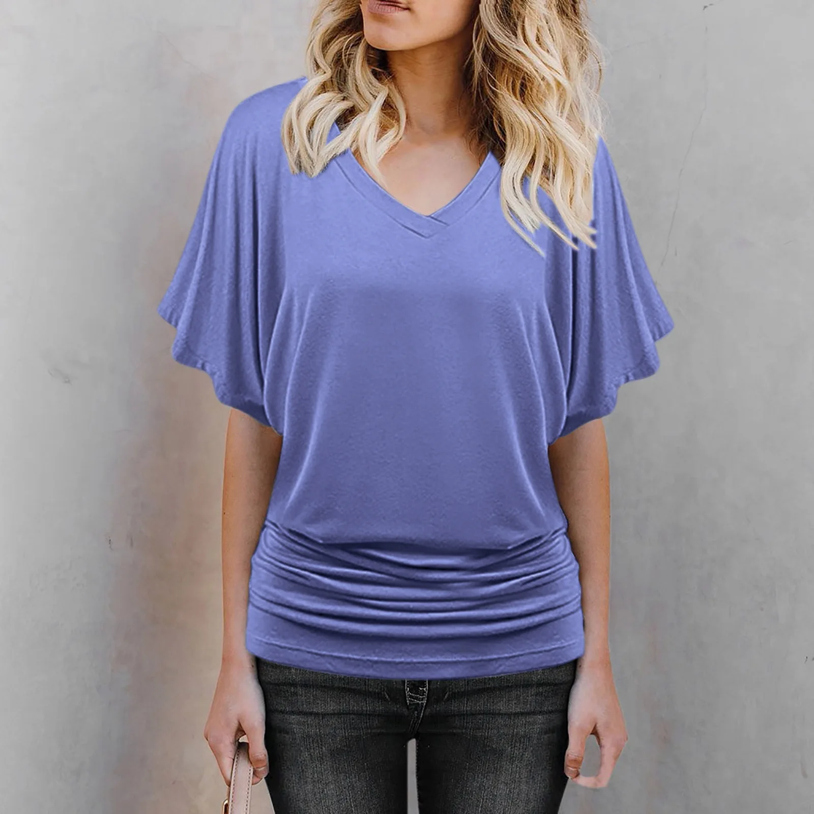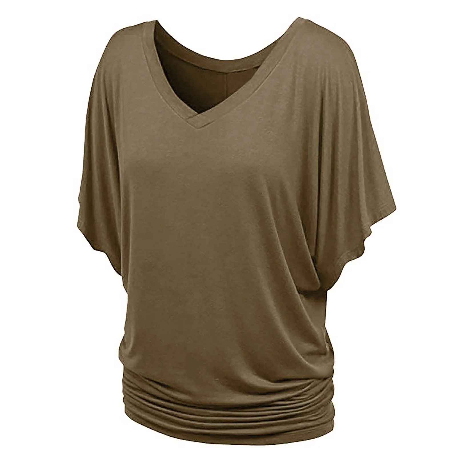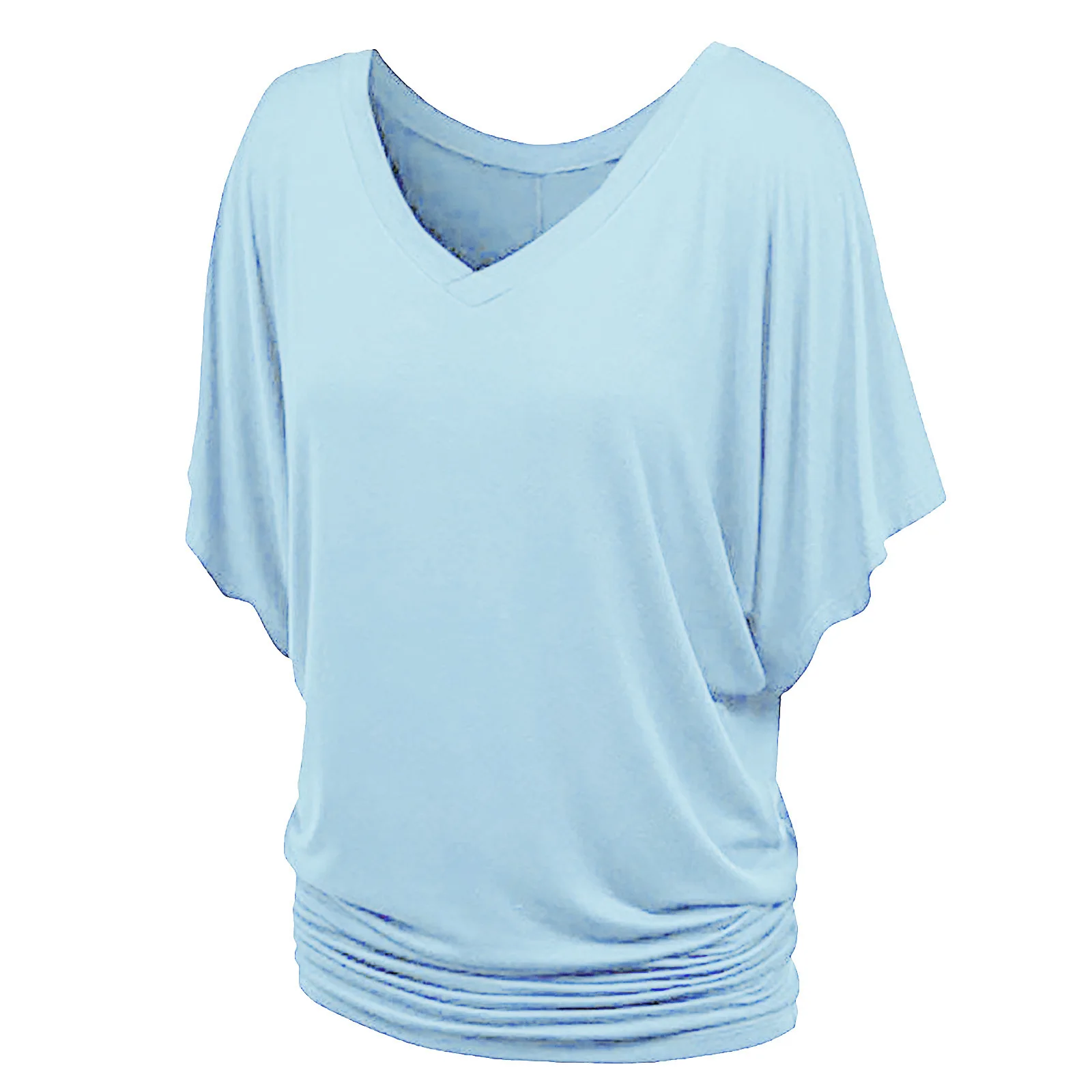 2 reviews for 2024 New Summer Commuting Minimalist Loose Fit Plus Size Straight Tube Batwing Sleeve Solid V-neck Hem Folds Women’s T-shirt Top