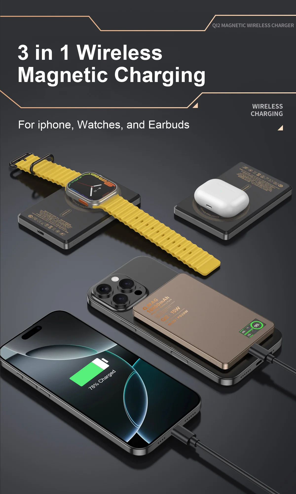 7. It supports magnetic wireless charging for all series of iPhone 16~12,as well as the latest generation of Huawei and Xiaomi phones, watches, and earbuds.with automatic induction wireless charging