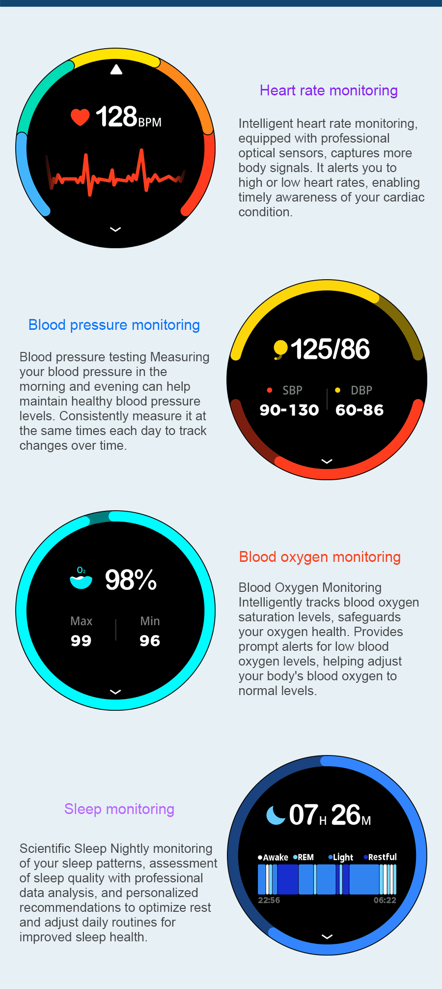 • Metrics measured: Heart Rate Monitor,Women’s Health Monitoring,Other,Blood Oxygen Monitor,Sleep Monitor,Blood Pressure Monitor,Stress Monitor