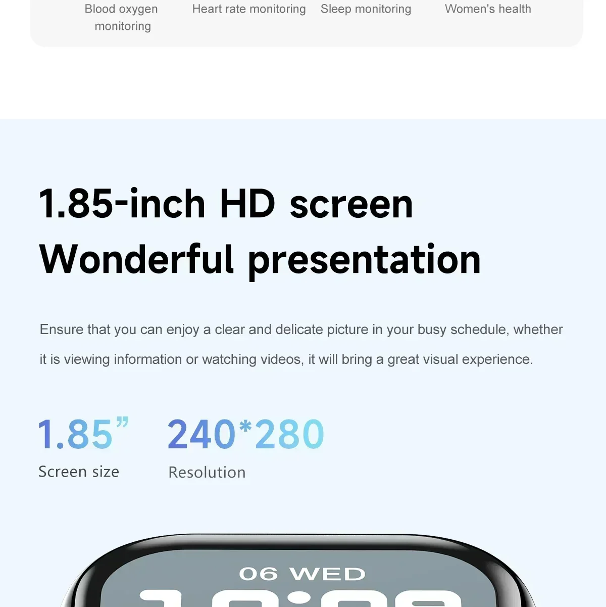Basic functions: phone (contacts, call history, dialing keypad, call settings, SOS), message push, exercise, step counting, sleep detection, music, heart rate, blood pressure, blood oxygen, body temperature, women’s health detection, medication reminder, Drink water reminder, sedentary reminder, style switching, calendar, voice assistant, weather, photo, calculator, breathing, my QR code, timer, find phone, stopwatch, exercise track, alarm clock, settings, restore factory settings, Drink water reminder, sedentary reminder, split screen (slide to the right), widget (slide to the left)