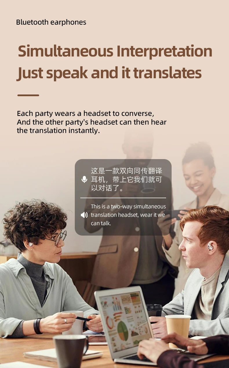 Touch Mode: Either party can speak after tapping the earphone (and hearing the prompt tone); simultaneous interpretation plays sync on both earphones for natural turn-taking dialogue.