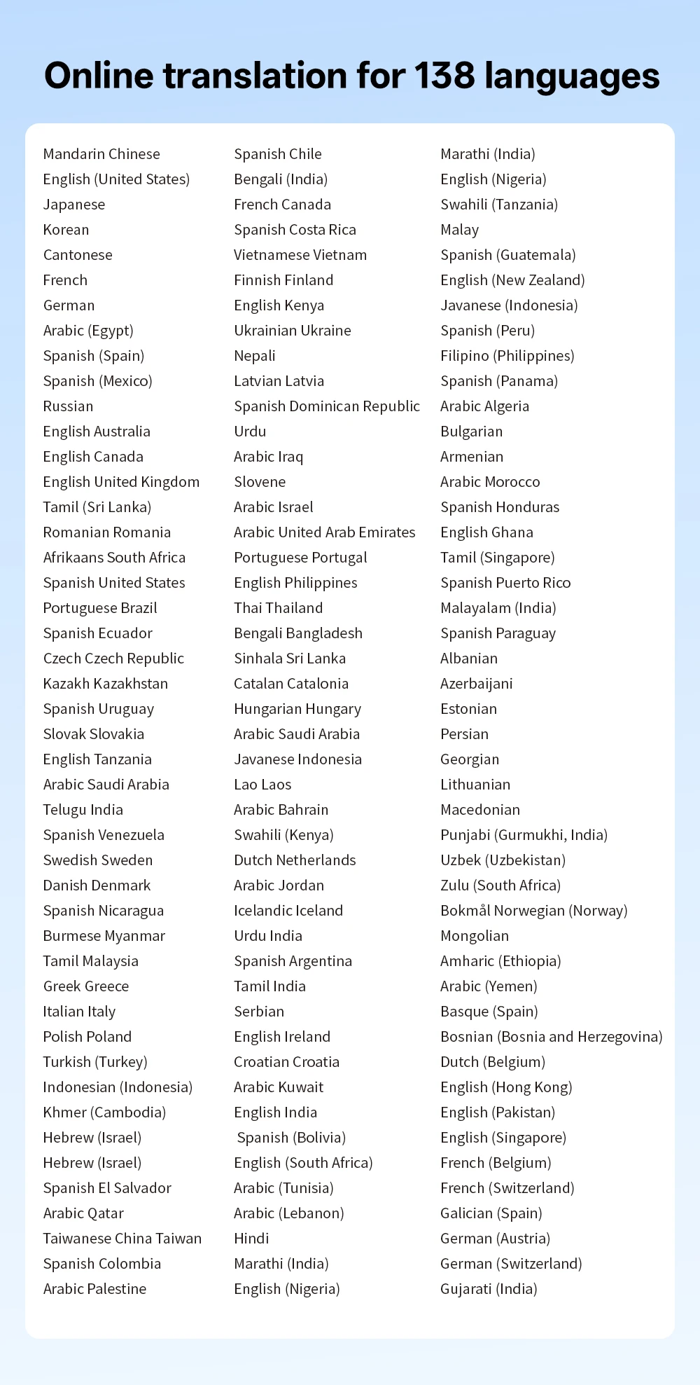 - Output Language: Spanish,Chinese,Arabic,Russian,French,Korean,Portuguese,Japanese,Italian,English