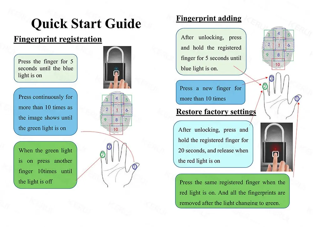 A1: Before entering the fingerprint, any fingerprint can be unlocked. If fingerprints are recorded, only the recorded fingerprints can be used to unlock the lock. Therefore, under normal circumstances, you must record more than two fingerprints to prevent the embarrassing situation of the fingers being scratched and unable to unlock.