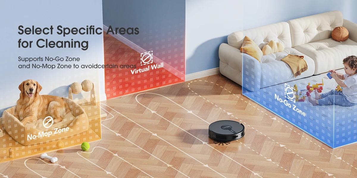 • 4 Cleaning Modes: Whole-room/Spot/Zone/Area cleaning.