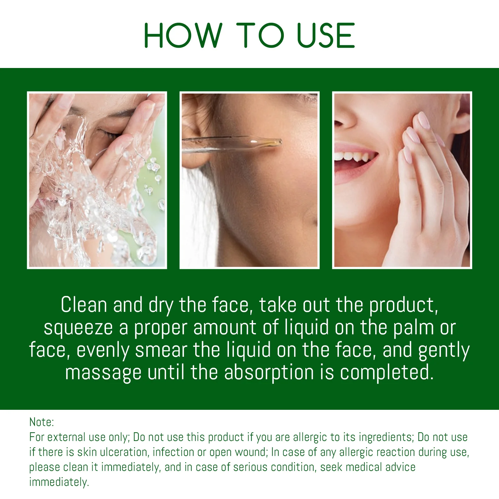 Clean and dry the face , take out the product,squeeze a proper amount of liquid on the palm or face , evenly smear the liquid on the face , and gently massage until the absorption is completed