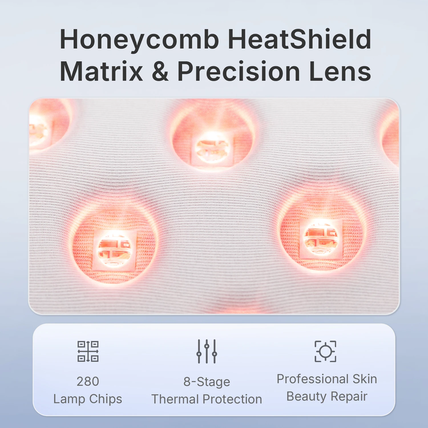 Our red light therapy mask features an advanced honeycomb structure combined with an 8-level temperature control system, designed to eliminate direct contact between the skin and LED bulbs— removing any risk of burns or overheating. Equipped with 280 professional-grade LEDs (70×630nm, 70×850nm, 70×605nm, 70×460nm), each light uses precision lens focusing technology to enhance energy penetration and deliver targeted, deep-layer treatment.