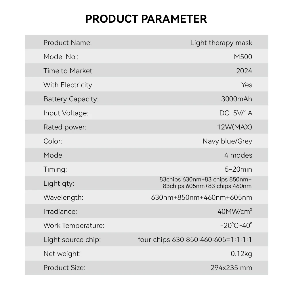 - Wavelength: 630NM+850NM+460nm+605nm