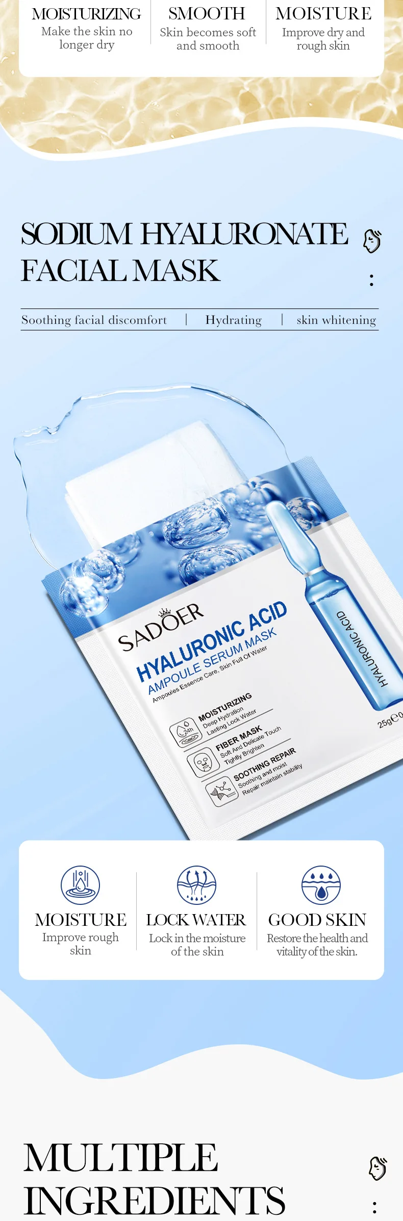 10pcs SADOER 24K Gold Vitamin C Hyaluronic Acid Face Mask Facial Moisturizing Firming Hydrating Facial Masks Skin Care Products