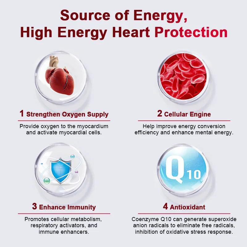 Brain work and energy – Coenzyme Q10 plays a vital role in energy production in the body. Regular intake of CoQ10 supplements helps increase natural CoQ10 levels and directly improves mental ability, brain work and function.