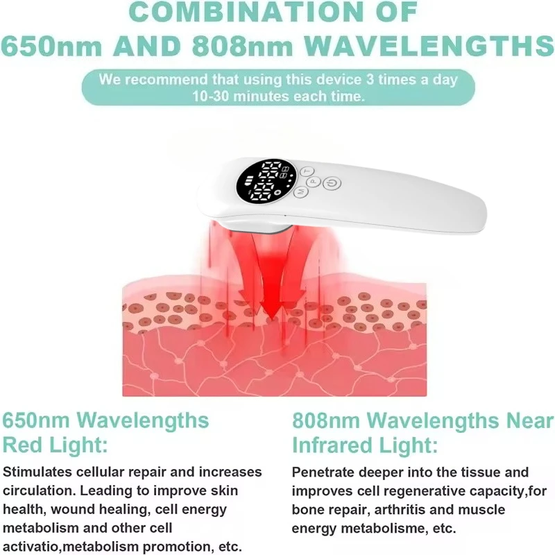 ✅【LLLT – Perfect Combination of 650nm and 808nm】650nm red light can reach the subcutaneous tissue, it helps with collagen production, reduce inflammation, stimulate cellular repair and increases blood circulation, applied to skin health, sports injuries, pain relief. 880nm light can penetrate deeper into the tissue, it tends to enhance metabolism, improve cell viability. It help with muscle recovery, wounds healing. Both combination will have better curative effect for animals.