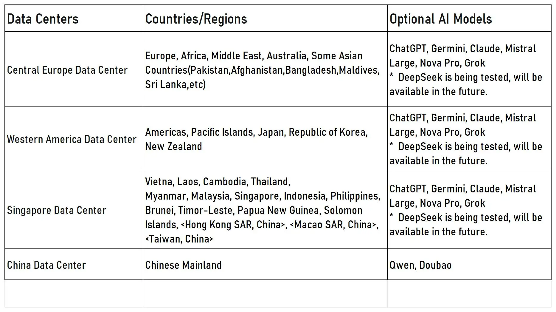 * DeepSeek is being tested, unavailable for now, but will be available in the future.