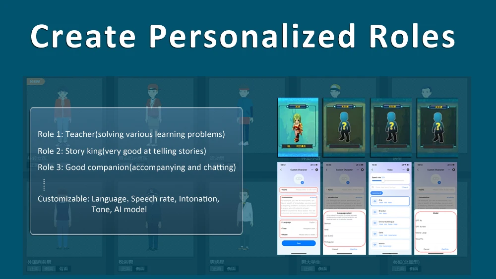 – The AI robot has been preset a role, default language is English. After the robot is added in Smart Life app, tap “Role Edit” to change the language.