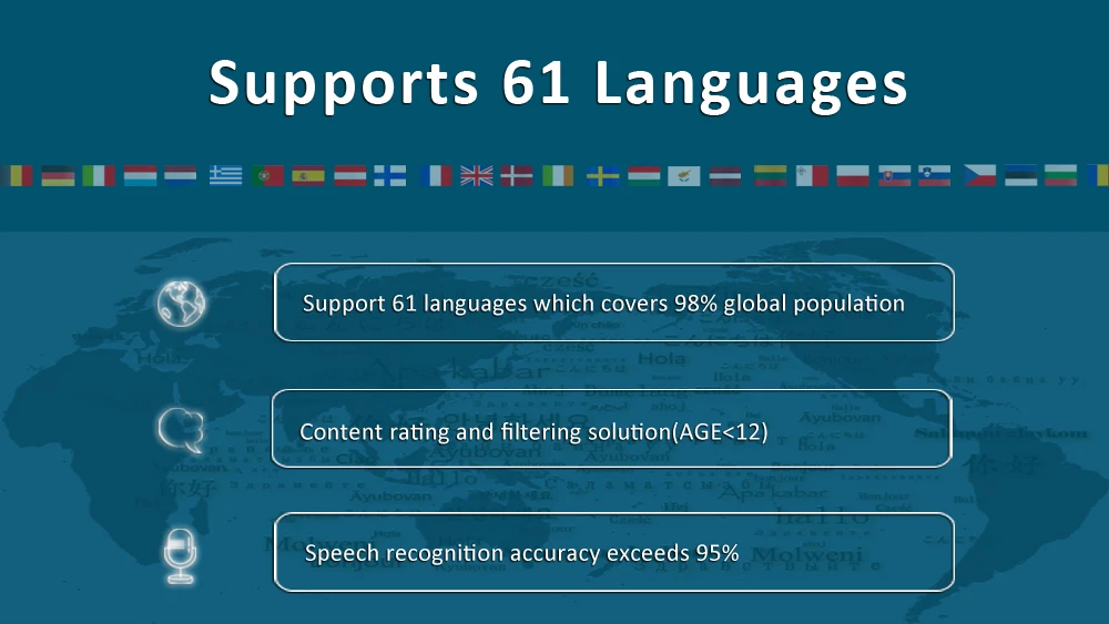 – Support 61 languages which covers 98% global population