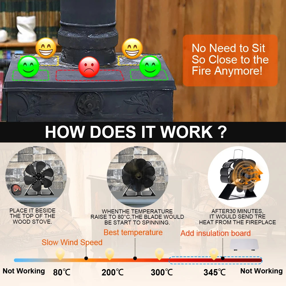 【Working principle】The thermoelectric module in the fireplace fan acts as a small generator to drive the fan’s motor, so the drive/operation of the fireplace fan does not require batteries or electricity. The fireplace fan is placed on the mantel and uses the temperature/thermal energy on the mantel to generate electricity to drive the fireplace fan. The rotation speed of the fan varies depending on the combustion temperature in the mantel. The higher the furnace temperature, the faster the speed. When the furnace temperature is so low that the fire goes out, the fan speed of the fireplace slows down until it stops rotating. Normal operating temperature 50°C to 350°C.