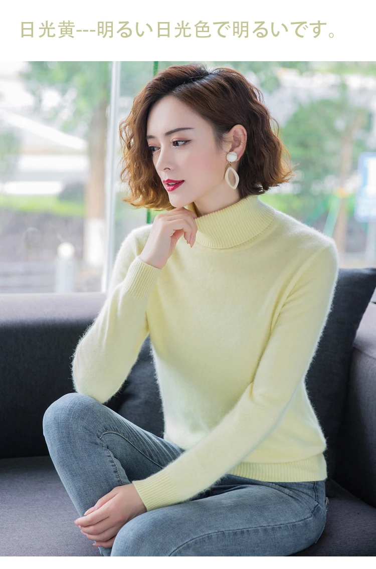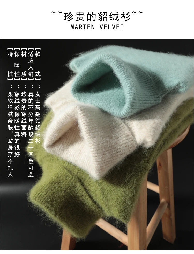 Cute sweater, color exactly as in the photos. The turtleneck is quite high but not tight, it nicely wraps around the neck. I took a size larger so it wouldn’t be too tight, so if you want it looser, take one or two sizes larger. I recommend it.